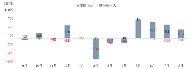 3. 運用残高の変動要因としては、運用益が313億円となり、102億円の資金純流出がありました。