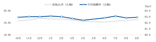5.直販比率は当社グループが運用する公募投資信託残高に占める直販取扱投信の残高比率です。投信平均報酬率は当社グループが運用する公募投資信託の信託報酬率のうち、当社グループが委託会社、販売会社として受け取る報酬率の平均値です。