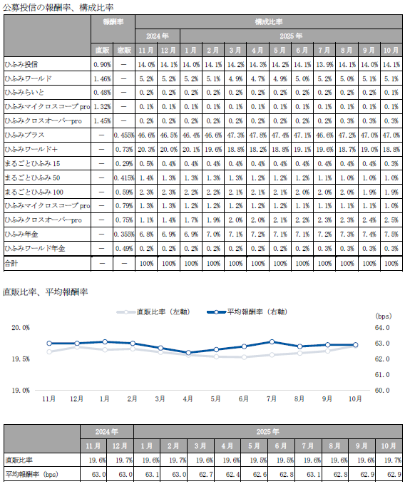 5.直販比率は当社グループが運用する公募投資信託残高に占める直販取扱投信の残高比率です。投信平均報酬率は当社グループが運用する公募投資信託の信託報酬率のうち、当社グループが委託会社、販売会社として受け取る報酬率の平均値です。