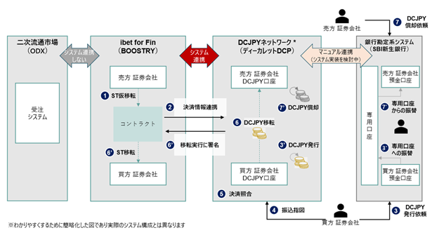 株式会社SBI証券(代表取締役社長:髙村 正人、以下「SBI証券」)、大和証券株式会社(代表取締役社長:荻野 明彦、以下「大和証券」)、株式会社SBI新生銀行(代表取締役社長:川島 克哉、以下「SBI新生銀行」)、株式会社BOOSTRY(代表取締役社長:平井 数磨、以下「BOOSTRY」)、大阪デジタルエクスチェンジ株式会社(代表取締役社長:朏 仁雄、以下「ODX」)、株式会社ディーカレットDCP(代表取締役 社長執行役員 CEO兼COO:平子 惠生、以下「ディーカレットDCP」)は、セキュリティトークン(以下「ST」)1の二次流通市場の発展に向けた新たな決済スキームを実現するべく、2025年12月26日付「国内初のトークン化預金によるセキュリティトークン決済の実発行検証に関する協業開始について」2に基づき、トークン化預金DCJPY(以下「DCJPY」)を利用したSTのDVP3決済の実証(以下「本プロジェクト」)を実施しました。