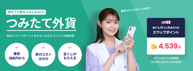 つみたて外貨は、「FXの仕組み」を活用して外貨を積み立てるサービスです。100円からコツコツと積み立てられるため、初心者の方でも取り組みやすく、中長期的な資産運用をご提案できるサービスとなっております。