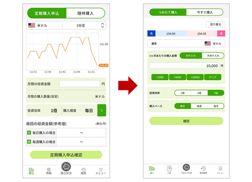 また、購入方法も「定期購入」→「つみたて購入」、「随時購入」→「今すぐ購入」とし、初めての方でも迷わず操作できるよう改善いたしました。